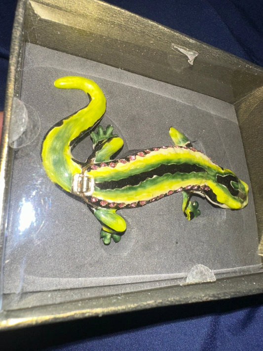 Green Lizard Enamel Hinged Lid Jeweled Crystal Magnet Jewelry Trinket Box