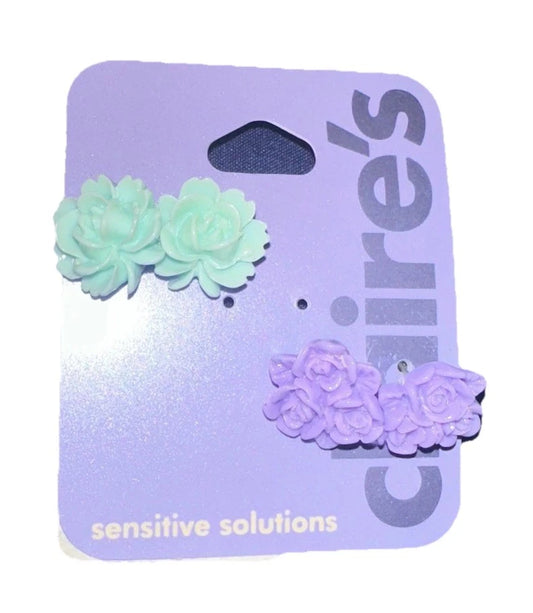 2 Pair Claire's Sensitive Solutions 3D Rose Flower Mint & Purple Stud Earrings